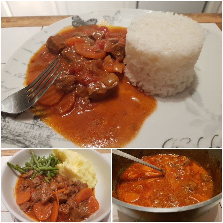 This is a perfect dinner on a cold winters night, served with either mash potato and green beans or with boiled white rice and a French stick to mop up the sauce.