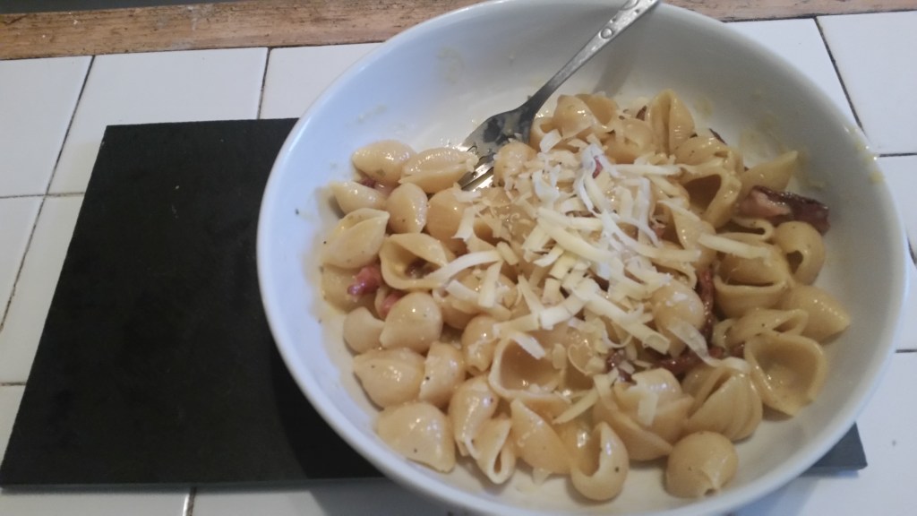 I always thought Carbonara was made with cream until I found this recipe and was very surprised there was not a drop of cream in sight. It was a lot better it wasn’t as heavy as other traditional creamy pasta recipes and so you can enjoy more…please read the top tip before cooking this dinner…