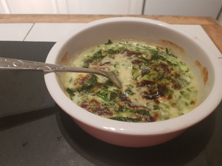 - Chop the spinach into small pieces and add to the cheese sauce and stir. Pour the cheese and spinach into a baking dish.