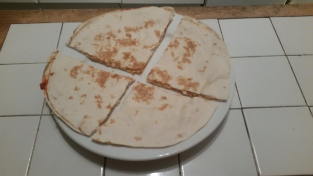 - Remove pan from the heat, place a large plate over the pan and turn the pan upside down to turn the quesadilla out on to the plate. Slide the quesadilla back into the pan, uncooked side down and cook for a further 1.5 – 2mins.
