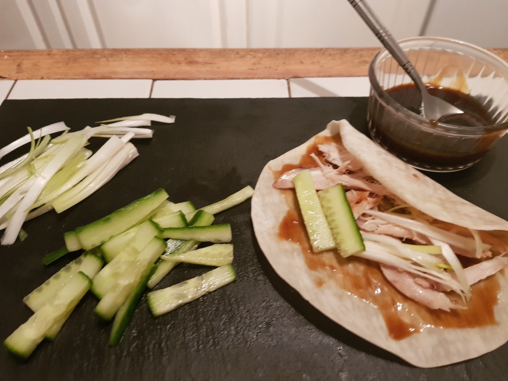 - Spread some hoisin sauce in the centre of each pancake, top with a few slices of chicken, scatter with cucumber and spring onion, roll the pancake and enjoy.
