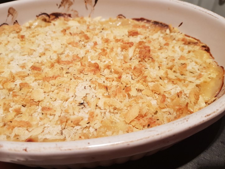 - Spoon over the cheese and mustard sauce, scatter over the crumbs and bake in the oven for 15mins until the crumb is golden and the sauce is bubbling. Serve with peas or green veg.