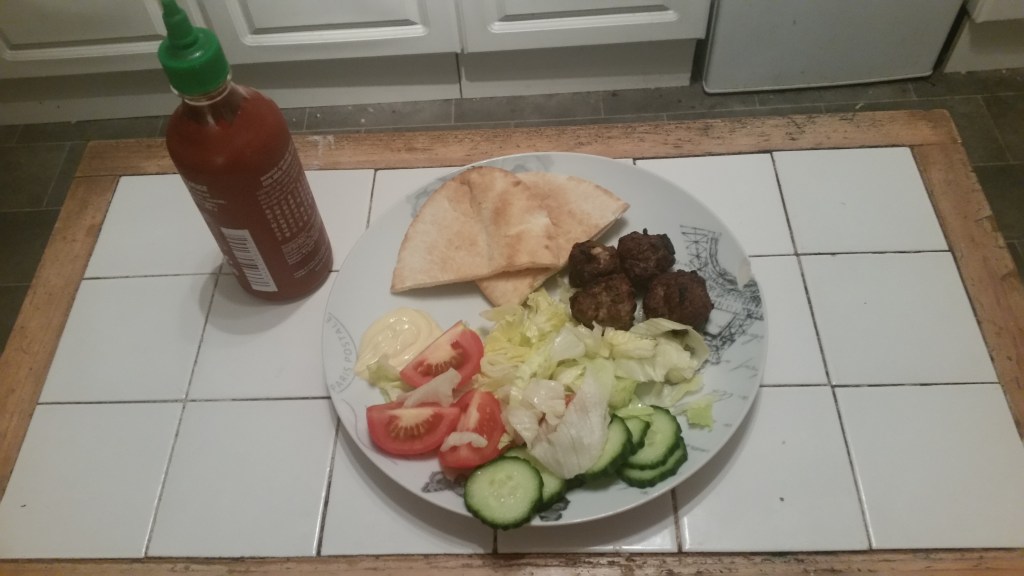 - When your kebab balls are nearly cooked, cut your pitta’s in half and toast. Serve immediatley with salad and shop bought chilli sauce, or I prefer mine with burger sauce – simply amazing….