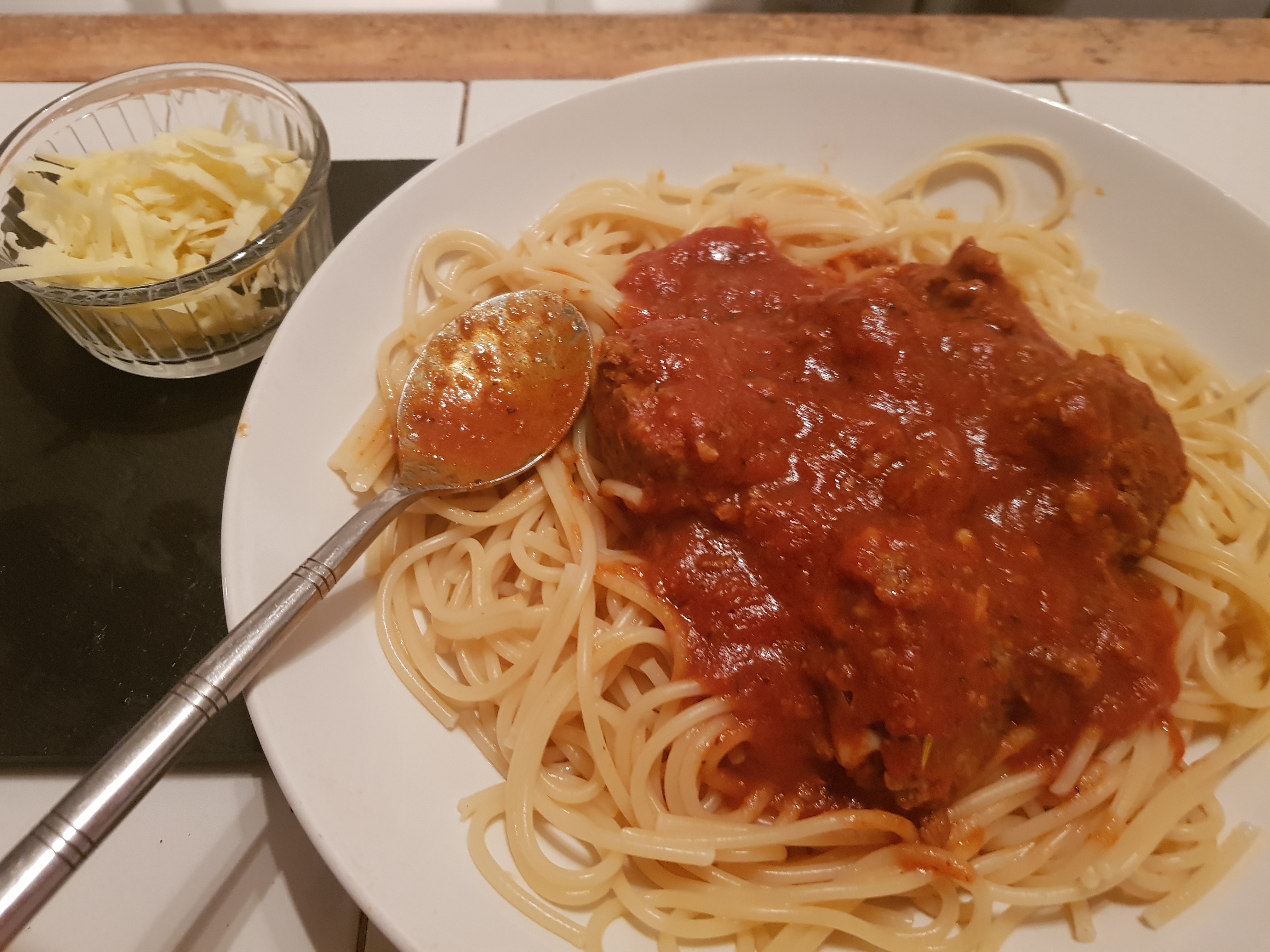 - In the meantime, cook the spaghetti according to the packets instructions, drain and serve with the meatballs on top sprinkled with grated cheese.