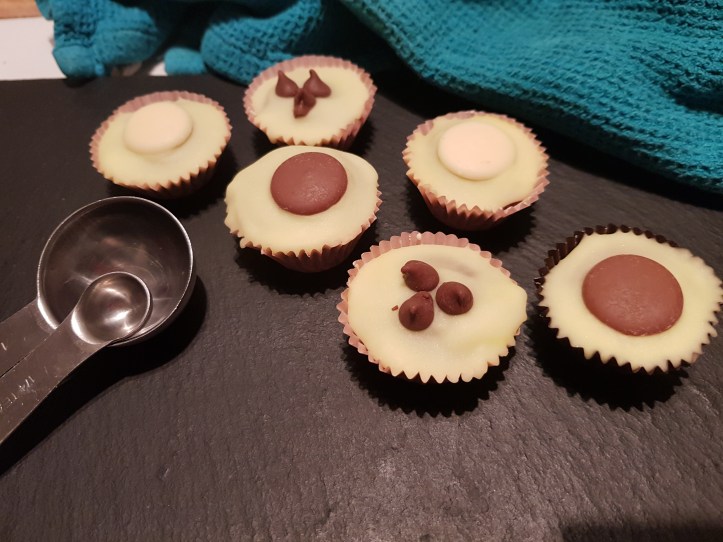 - Stir the icing until its smooth. Use a teaspoon to spread a little icing onto each cake. Decorate the cakes the buttons and drops, you could even use chocolate shavings.