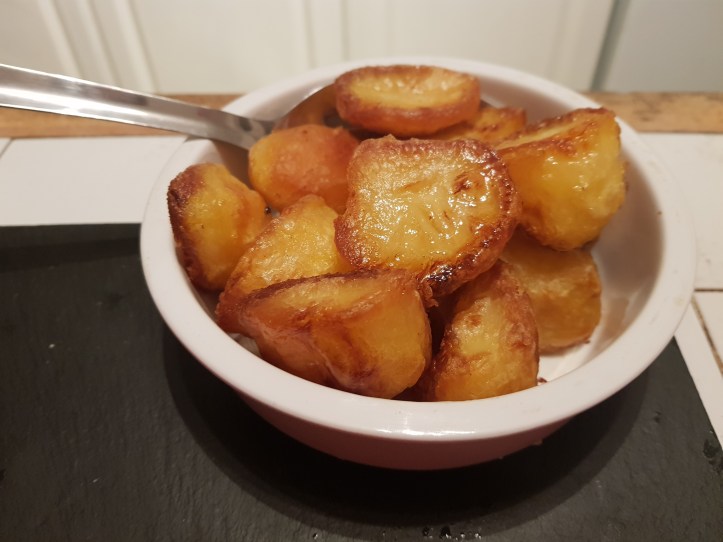 - Drain the potatoes in a colinder and shake a few times to make the potatoes edges slightly roughed up. Tip into the hot oil, roll over and cover each potato in oil and place in the oven for 60mins.
