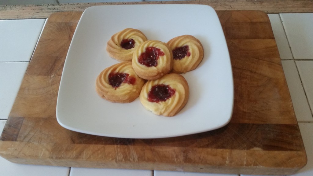 - Spoon the mixture into a large piping bag fitted with a large star nozzle. Pipe rings on a baking sheet. Space out, leaving room for the biscuits to expand during cooking. Place a small dollop of jam in the centre of each tart.